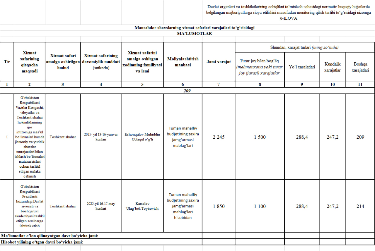 Mansabdor shaxslarning xizmat safarlari xarajatlari to‘g‘risidagi MA’LUMOTLAR