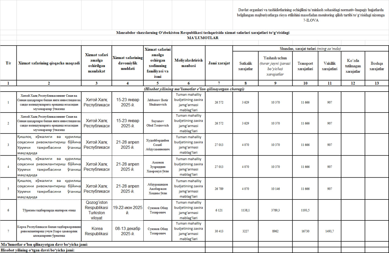 Mansabdor shaxslarning O‘zbekiston Respublikasi tashqarisida xizmat safarlari xarajatlari to‘g‘risidagi MA’LUMOTLAR