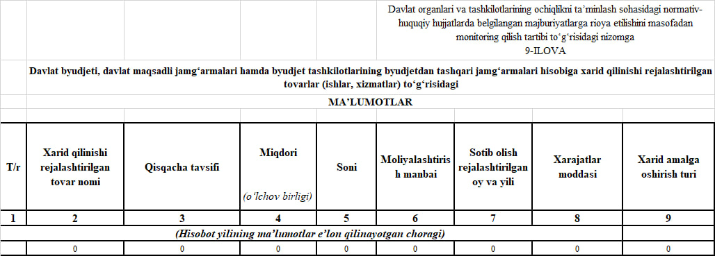 Davlat xaridlari to‘g‘risidagi ma’lumotlar, shu jumladan davlat xaridlarini amalga oshiruvchi shaxslar tomonidan to‘g‘ridan to‘g‘ri shartnomalar bo‘yicha xarid qilinadigan tovarlar (ishlar, xizmatlar): 4-срщкфл