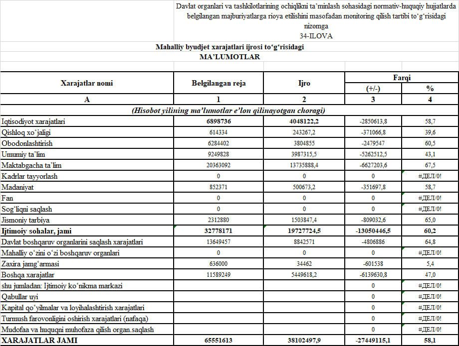 Mahalliy budjetlarning har chorak yakunida shakllantiriladigan daromadlar va xarajatlar smetasi, rejadan orttirib bajarilgan qismi va mazkur mablag‘lar yo‘naltirilgan maqsadlar to‘g‘risidagi ma’lumotlar: